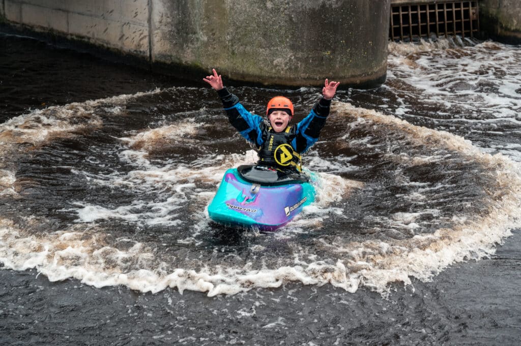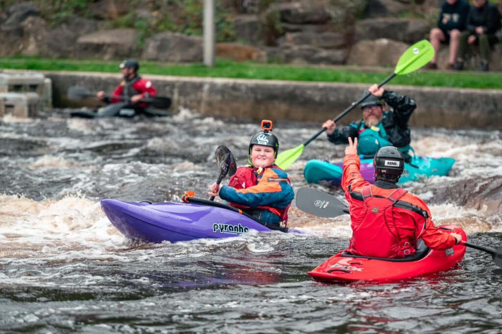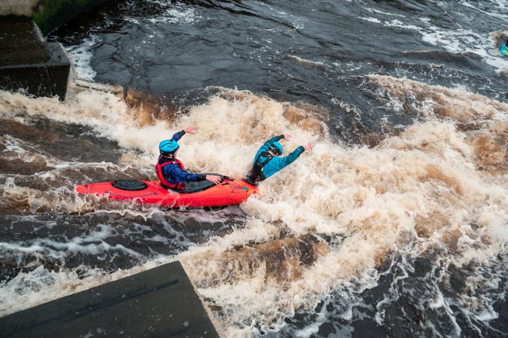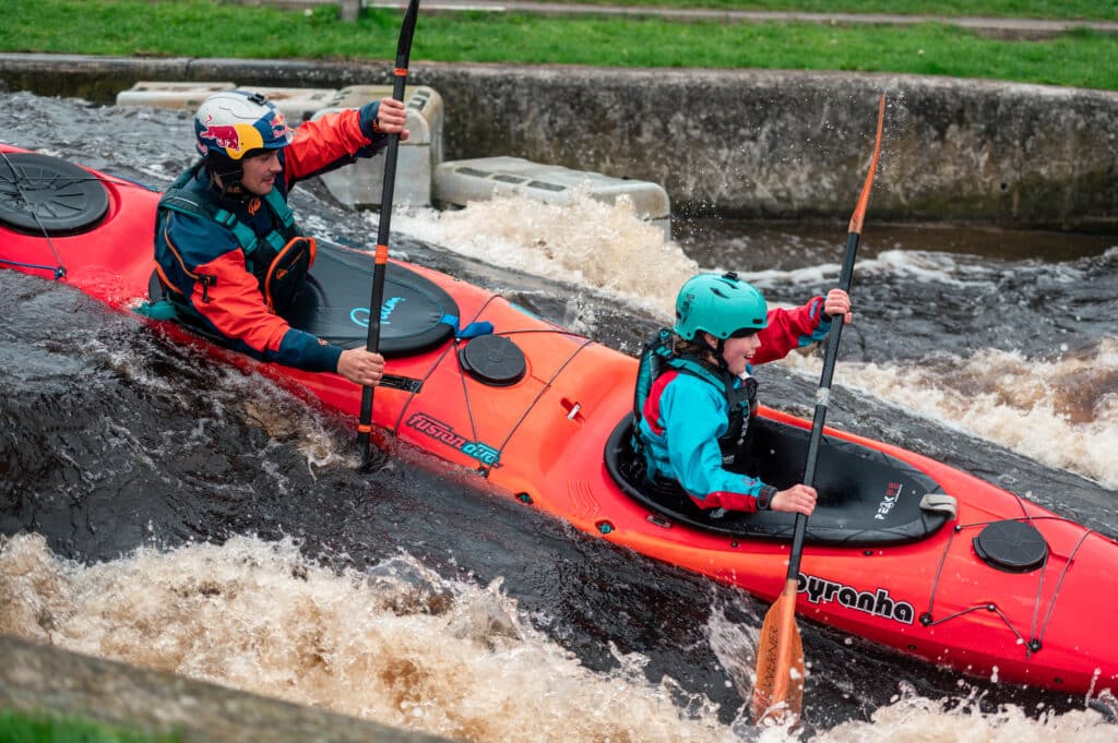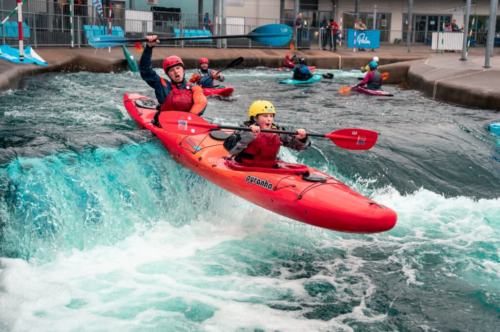 A family I’d met at the Nene the previous weekend had come to Cardiff today. The kids George and Isabel were keen for kayaking but didn’t have a huge amount of white water experience. I asked if they would like to come down in the duo and Isabel was very keen on the idea! Once again I asked our best duo driver, Oli, if he would come down and off they went. They smashed their laps and every time Isabel had the biggest smile!