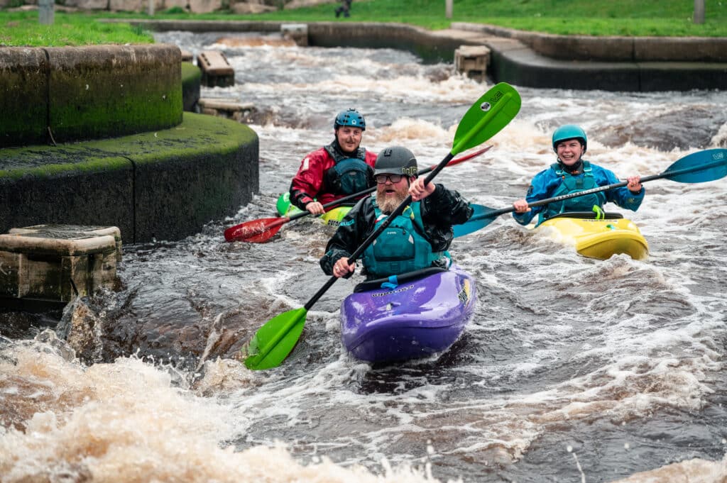 George wanted to swap kayaks with Scott so Scott reluctantly handed his ReactR over in exchange for George’s Firecracker. I challenged Scott to try some laps in that and he agreed which was great fun. It took us a few attempts but Scott did smash a whole lap from top to bottom upright in the Firecracker and was thrilled with himself. Proud of you Scott!