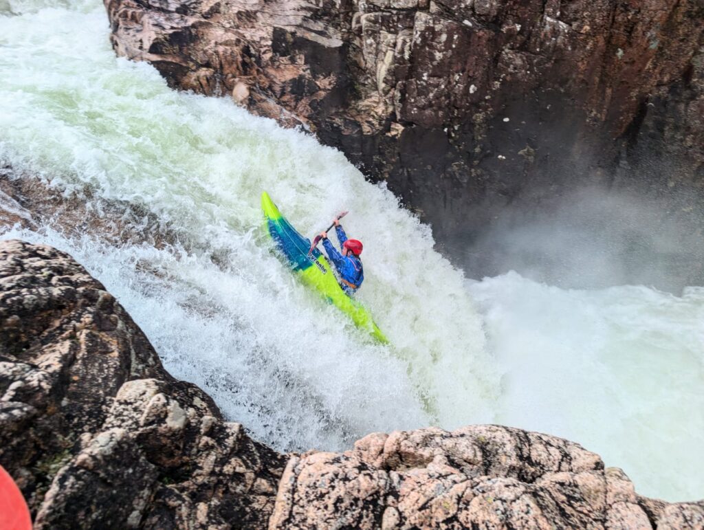He saved it as the bottom – only just. His entry line had involved an impromptu tailee of his ReactR on the lead in rapid, leading to a tailee of his kayak, saving it just enough to bring it down but be backwards as he went down the drop. I was frankly, quite impressed he saved it!